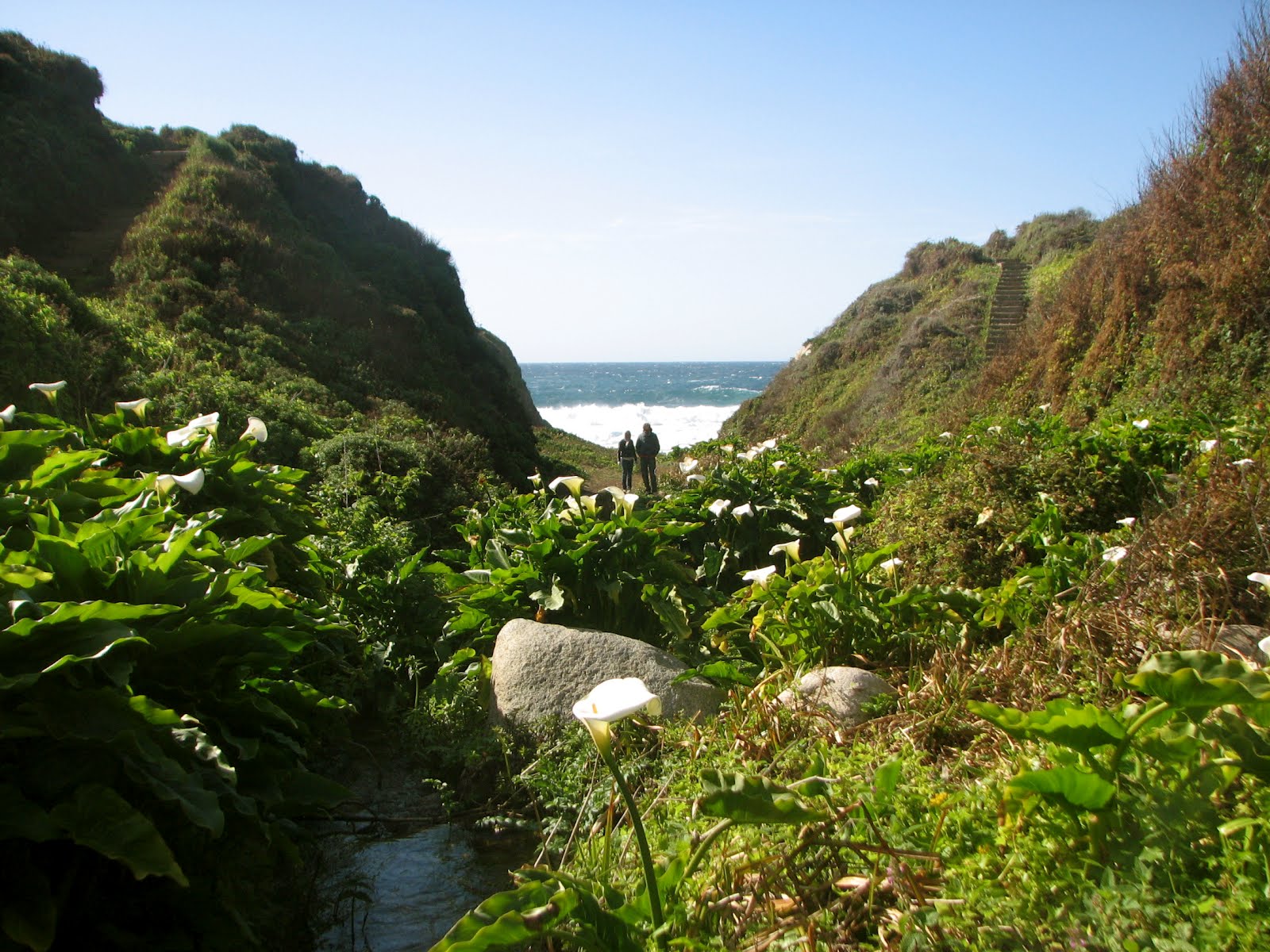 I'm so glad we did! A most magical place greeted us. A small, freshwater stream flowed from the bluffs, through a ravine and into the ocean. We followed the creek upstream. Within a few yards we were surrounded by an enchanted garden of wild calla lilies. We hopped across small pools of clear trickling water. I swore I heard the faeries giggling!